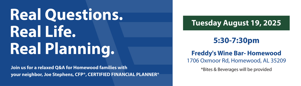 Join us for a relaxed Q&A for Homewood families with your neighbor, Joe Stephens, CFP®, CERTIFIED FINANCIAL PLANNER®